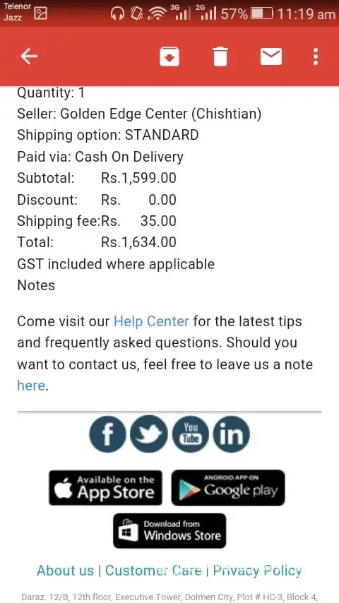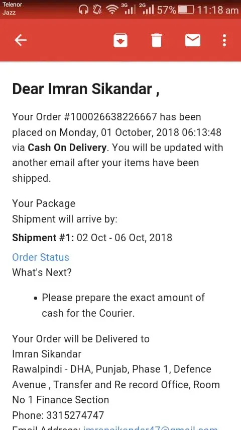 We ordered a blender & grinder of Dawlance few days ago and received the delivery of our our order (package IdL OP06422000090107 ) to day (6 October at around 1200 hrs) by the delivery van of Daraz after paying the amount of Rs.3220 in cash to the delivery boy.