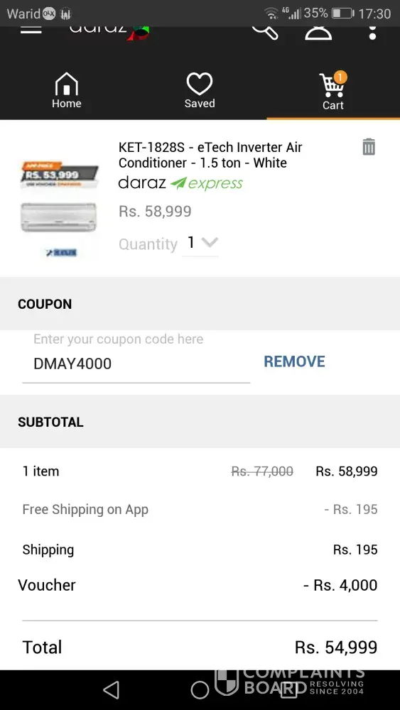 It is to highlight that, I had opted for kenwood dc inverter 1.5 ton. Who's actual price was 59, 000 and daraz had given app voucher price of 53, 999. But actually it had not been happened as per app scheme.