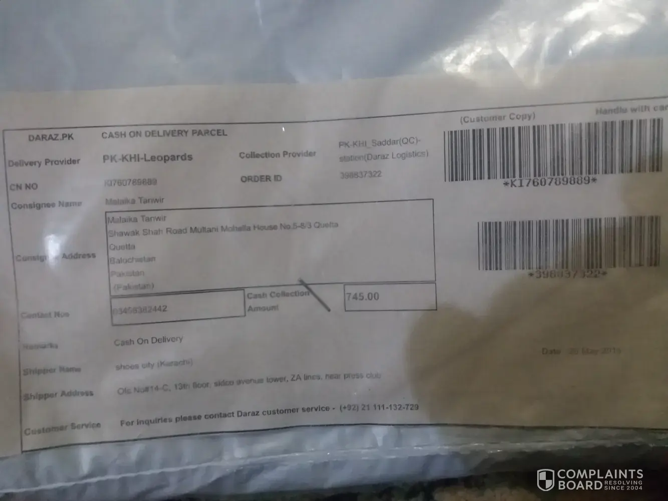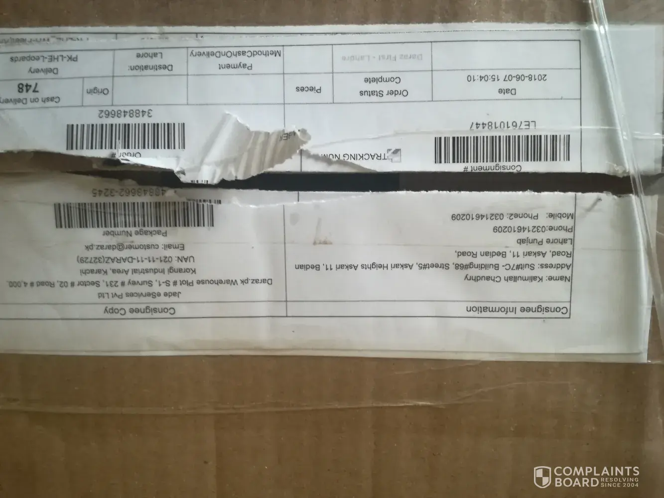 maine pack of 4 shirts mangwai thi jis ki price 200 thi with delivery charges 345 lakin parcel main se 1 shirt nikli or parcel main koi detail paper bhi nhi thy my order id 396165662 hai or shipper name : al fajar collection karachi hai or shipper address : house c-99 phase 2 gulshan e hadeed, karachi hai please solve my problem and reply me on my number [protected]