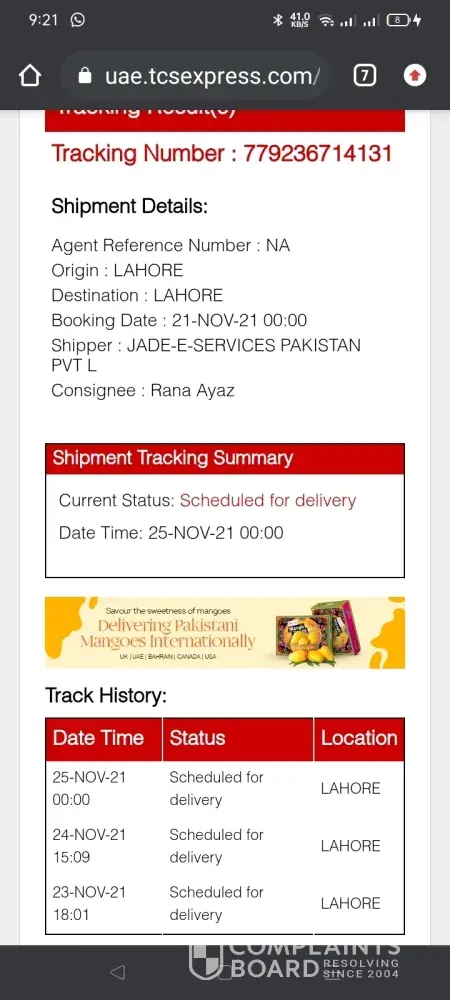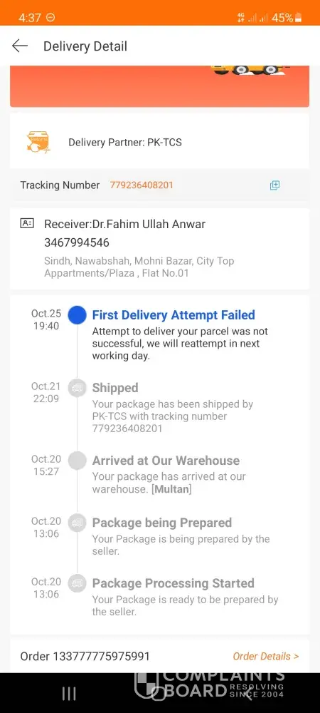 I placed my order via Daraz app which was received by my TCS office Nawabshah City on Saturday 23/10/2021 and I requested the said office to kindly provide the stuff in time (Call History screen shot is provided).