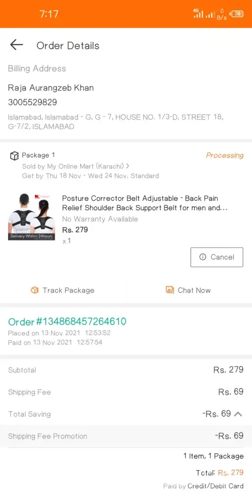 It is hereby reported that that on 13-11-2021, Placed and order # [protected] for Posture Corrector Belt, online through my MCB VISA debit card for Rs. 279/- only.