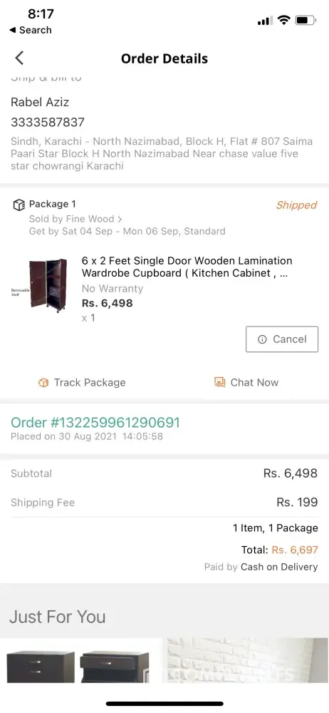 I ordered single door wooden wardrobe from your company on 30-08-2021 order # [protected].