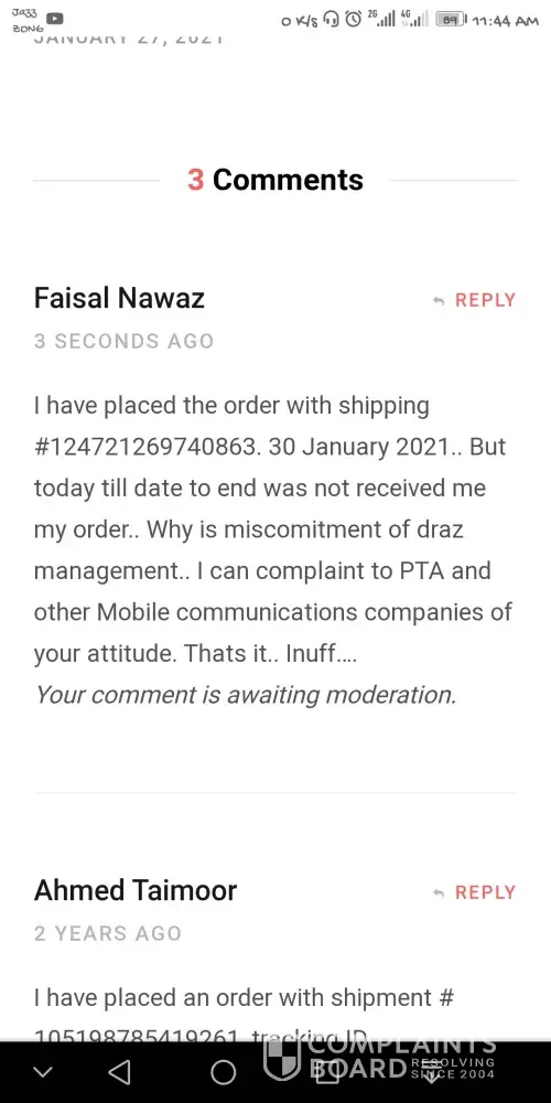 I have placed the order 124721269740863. 30 January 2021.. But today till date to end was not received me my order.. Why is miscomitment of draz management.. I can complaint to PTA and other Mobile communications companies of your attitude. Thats it.. Inuff...