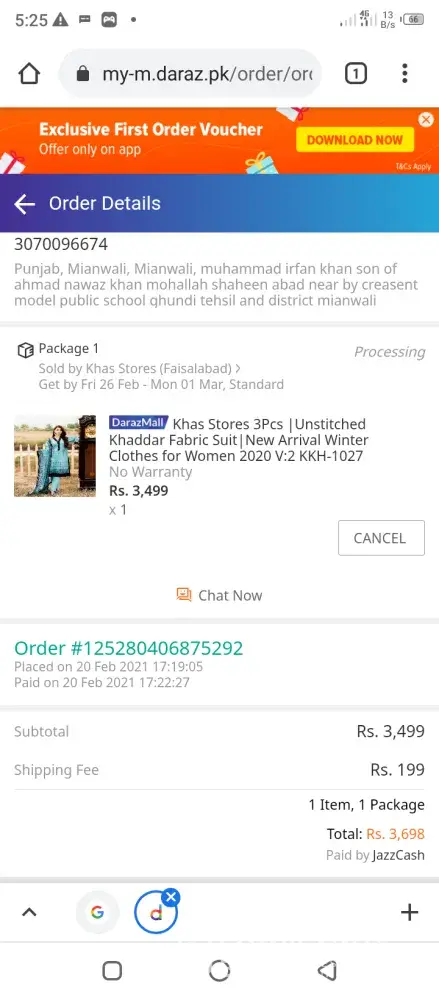 order [protected] was canceled .send thes order on this address tasleem uallah khan zari tarakiati bank mianwali.or return this my money [protected] jazz cash .2 days ago no response send by draz.pk
