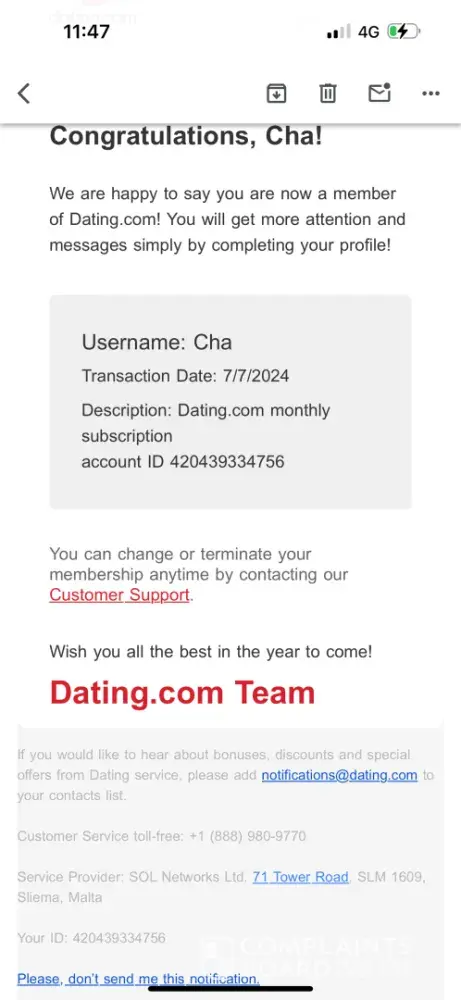 Thank you for sharing your comments. I am sorry if it took this much time to get back to you on this. I'm afraid you have mentioned a platform that does not have any affiliation with dating.com. I would best recommend that you contact their support directly to get the necessary resolution to your billing concern.