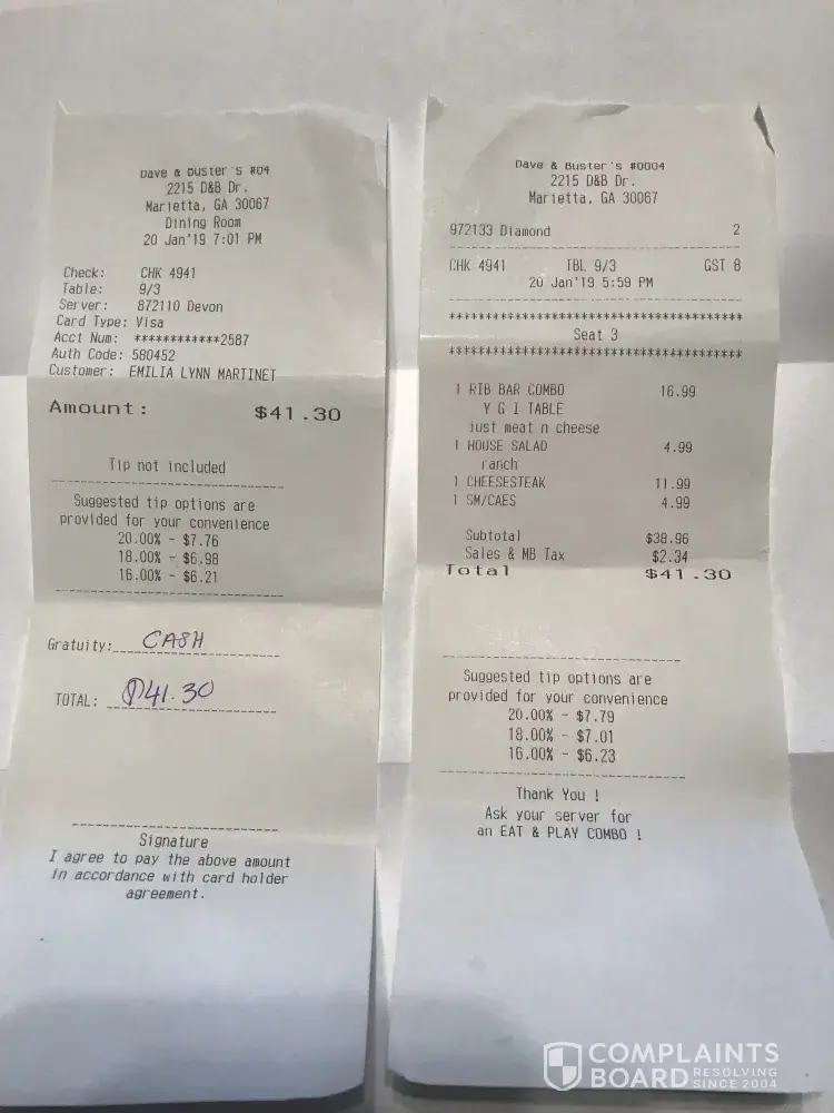 January 20, 2019 at 4pm my family met to celebrate my sister's birthday in Marietta, Georgia Dave and Busters. We put in our name for a table for eight and proceeded to wait thirty minutes while the dining area had over twenty tables empty. After being seated at 4:33pm, we ordered drinks, water and soda, which we received 24 minutes later. Our table then proceeded to order adult beverages and an appetizer. The appetizer came out in a timely manner and the adult beverages followed. The server then left without asking if we were ready to order and was not seen for 20 minutes. We then found her and asked her to take our order which caused us to recieve attitude from the waitress like we were an inconvenience. She took our orders except for two people at our table who were never allowed the opportunity to give their orders. A manager was contacted to take the remaining orders. After grabbing the attention of our manager the waitress was gone for 45 minutes never refilling drinks or letting us know if our food was coming out any time soon. The manager took our appetizer plate and refilled our drinks. Our food came out, my fiancé's ribs were cold and I asked for a side salad with my meal and received fries. We called the manager over again and told him the issues. My fiancé's ribs were replaced with hot ones and my Caesar salad was brought to me. The table of eight was then divided four ways. My fiancé's and myself had a total of $41.30 and left a cash tip. I signed the receipt and saw that I was charged for my side salad as if it was my fault for the waitress not putting it in the first time. So, we had the manger over to our table three times throughout our meal and at no point was apologized to for all the issues. Monday, January 21, 2019 I find that my card was charged $147.62 for the meal that should of been $41.30. I have called Guest services and left messages with no return phone call to dispute the charge to my account. It is now Wednesday, January 23, 2019 and I am filing a dispute with my bank against this outrageous charge. This was one of the worst experience I have ever had in a business. I know what it is like to be a waitress, myself, but at no point were the waitress or manager apologetic.