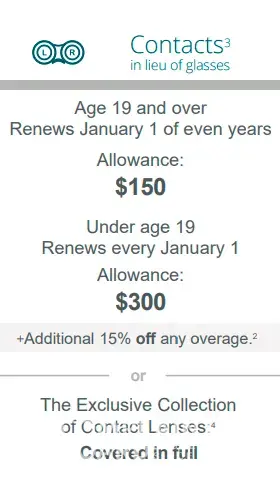 "The Exclusive Collection of Contact Lenses: Covered in full" - keep in mind the plan cycle is every 2 years. It also says exams/fittings are covered in full.