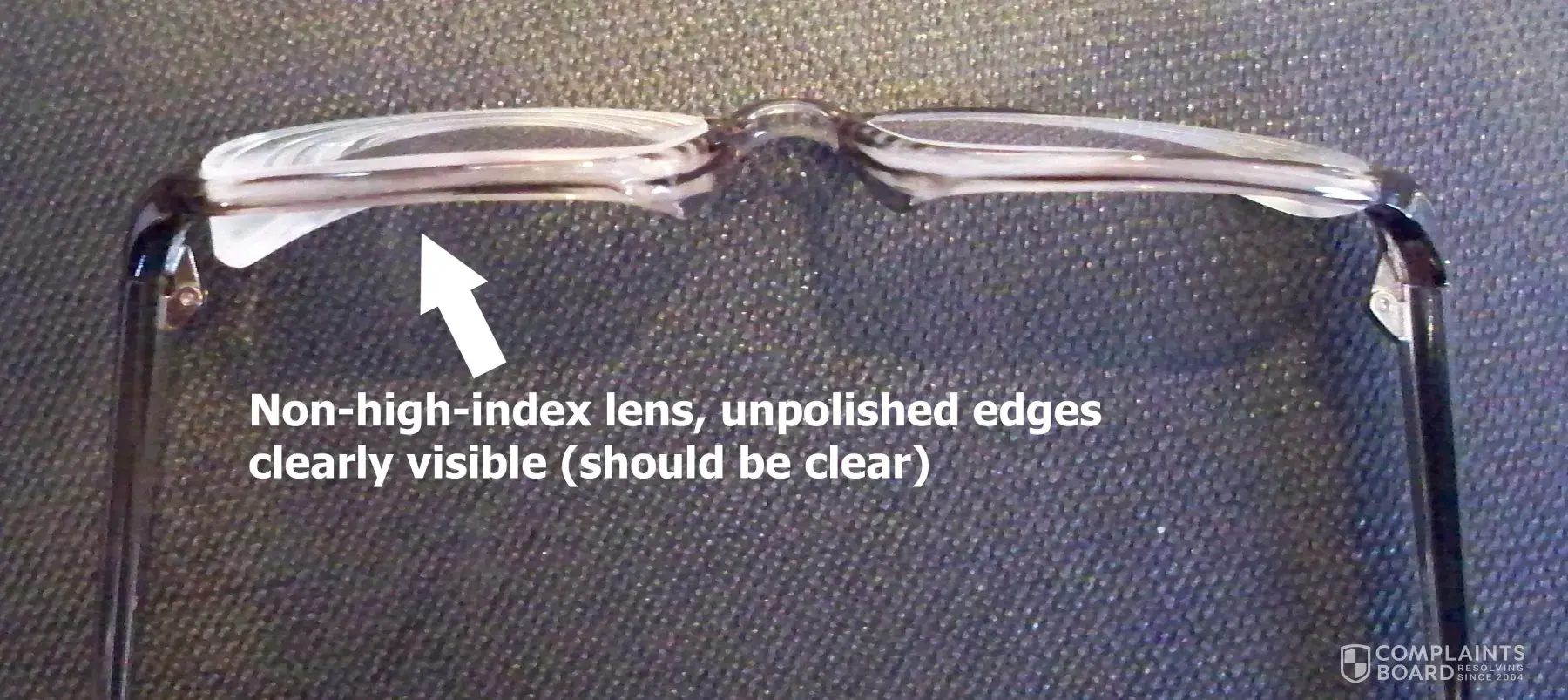 Mysteriously, on December 9, my glasses arrived at Manchester Eye Care. When I saw the glasses Davis had sent, I told them I would not accept them and wanted my money back. One lens is huge, the edges are not polished, and the lenses are not even set in evenly. (See photos.) When the staff person called Davis Vision, she was told that their lab did not understand that BOTH lenses should be high index; they made them with one high-index and one not. Davis also alleged that they did not know that the edges should be polished. (The staff person gave me a copy of what they sent to Davis, which I have scanned and am attaching here. It clearly shows that both lenses should be high-index - which I paid for - and that the edges should be polished. It also shows that there is a minute difference in prescription between my two eyes, which clearly indicates that the two lenses SHOULD appear equal in size.)