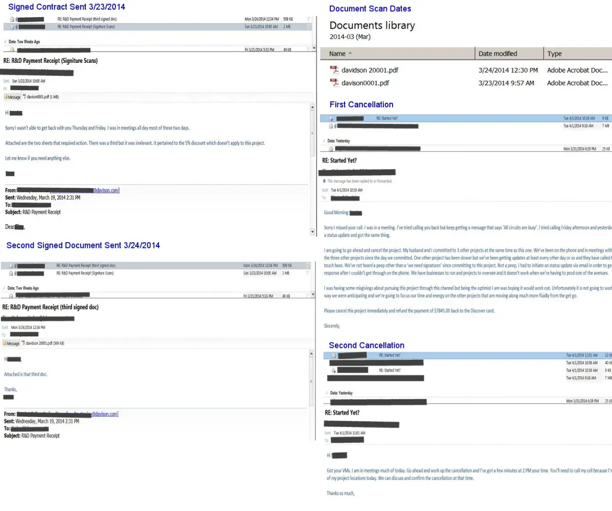 Now the CC company, the BBB, an attorney and the FTC is involved all because the cancellation clause in the contract was blown off by Davison. Time consuming for several people and a big mar for them. Whatever.