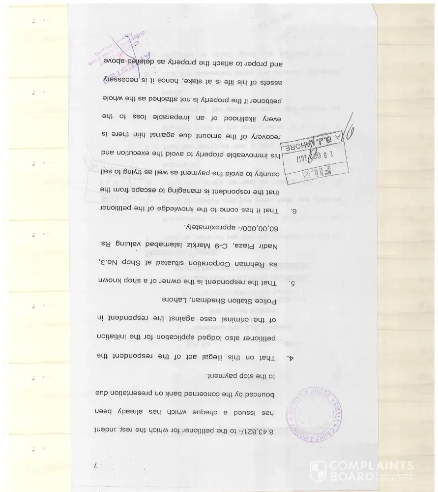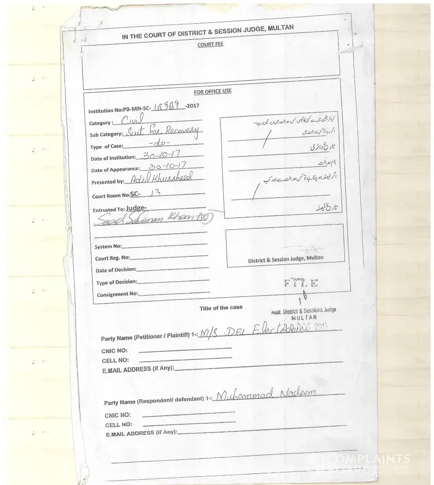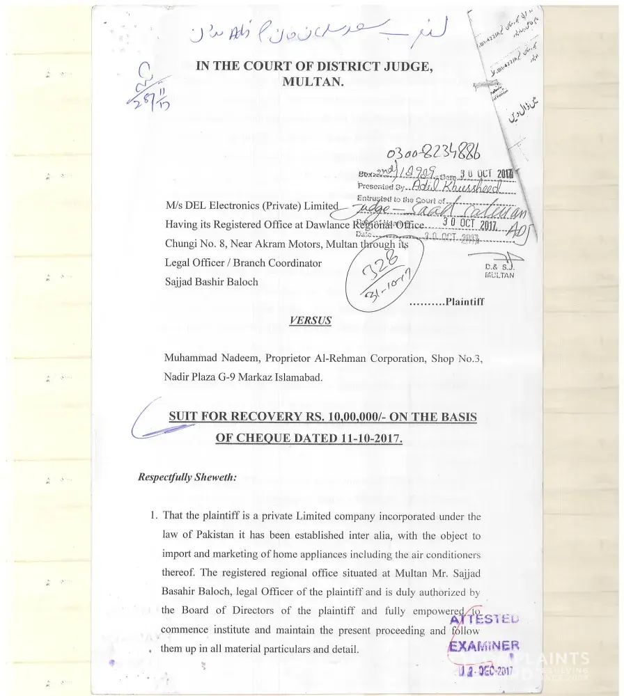 Due to negative behavior of Mr. Zaheer, Zonal Sales Manager, a civil suit titled RENDITION OF ACCOUNTS, CANCELLATION OF CHEUQES AND PERMANENT INJUNTION before the honorable court of Mr. Muhammad Shoaib Akhter Civil Judge 1st Class (West) Islamabad.