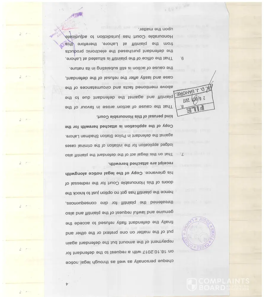 I am continuously asking either in discussions and also in writing to settle my issues with Dawlance but they never pay heed to them and are erecting walls against me by mal-practicing and wrong doings. A very interesting part of this whole episode is this, that Mr. Zaheer, Zonal Sales Manager, Rawalpindi, handing over my post dated cheques to Mr Arshad khan at Lahore Brach and Mr Sajid Baloch at Multan branche with mala-fide intention/ulterior motives without delivery of any goods, just to torcher me and my family and registrated a fake order 37 Suit in Lahare and Multan and then also registered a fake FIR at Lahore by Mr Arshad Khan and Multan by Mr Sajid Baloch, whereas I never been involved in business deals with Multan and Lahore branches of Dawlance. It is also very pertinent to mentioned here that goods of 800, 000/- from Lahore and 1000, 000/- from Multan was also included in my account, whereas I never dealt with the Lahore or Multan branch ever since, I started the business with Dawlance. That it pertinent to mention here that I has no direct relationship with the Dawlance Sales office Lahore / Multan, due to stoppage of invoicing / purchase of product two months ago, I stopped the payment of cheques in the favour of M/s Dawlance Rawalpindi despite the fact that the I contacted numerous authorities of M/s Dawlance Pvt Ltd including Mr. Salih Arsaln Tass C.E.O, Hassan jamil Country Sales Manger Pakistan, Mr. Talal Country Sales Head Karachi, Mr.Rouf Finance Head Head office Karachi, Mr. Asif Mushtaq Butt Regional Sales Manager, Major Ajmad Karachi.