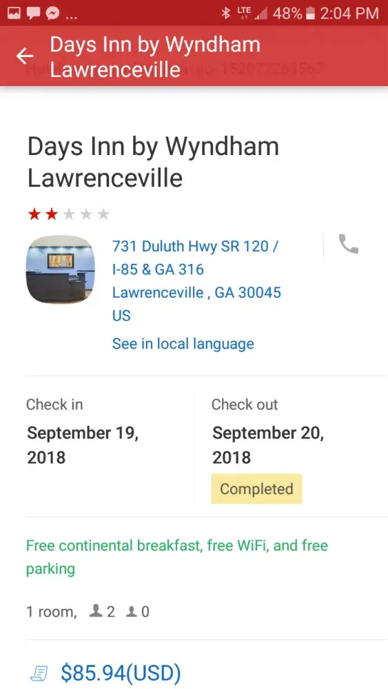 I booked a room at the days inn lawrenceville ga on duluth hwy 9/19/2018 thru hotels.Com. I booked this room fir my sister and her pet i stayed in a room with my fiancee we checked her in and i went in to get keys on 9/19/18 we decided she would stay there and pay nightly until we finished worming the fair in lawrenceville on the 23 rd i paid one other...
