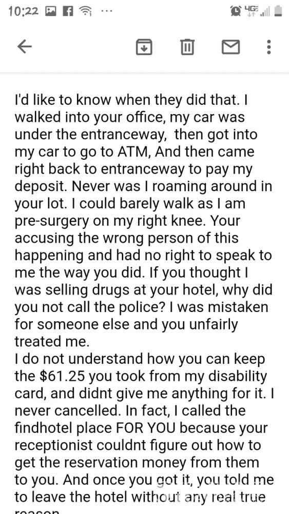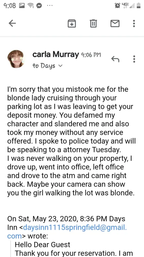 Days inn in springfield, mo. Slandered me, refused service to me, took my room money, and offered me no service.