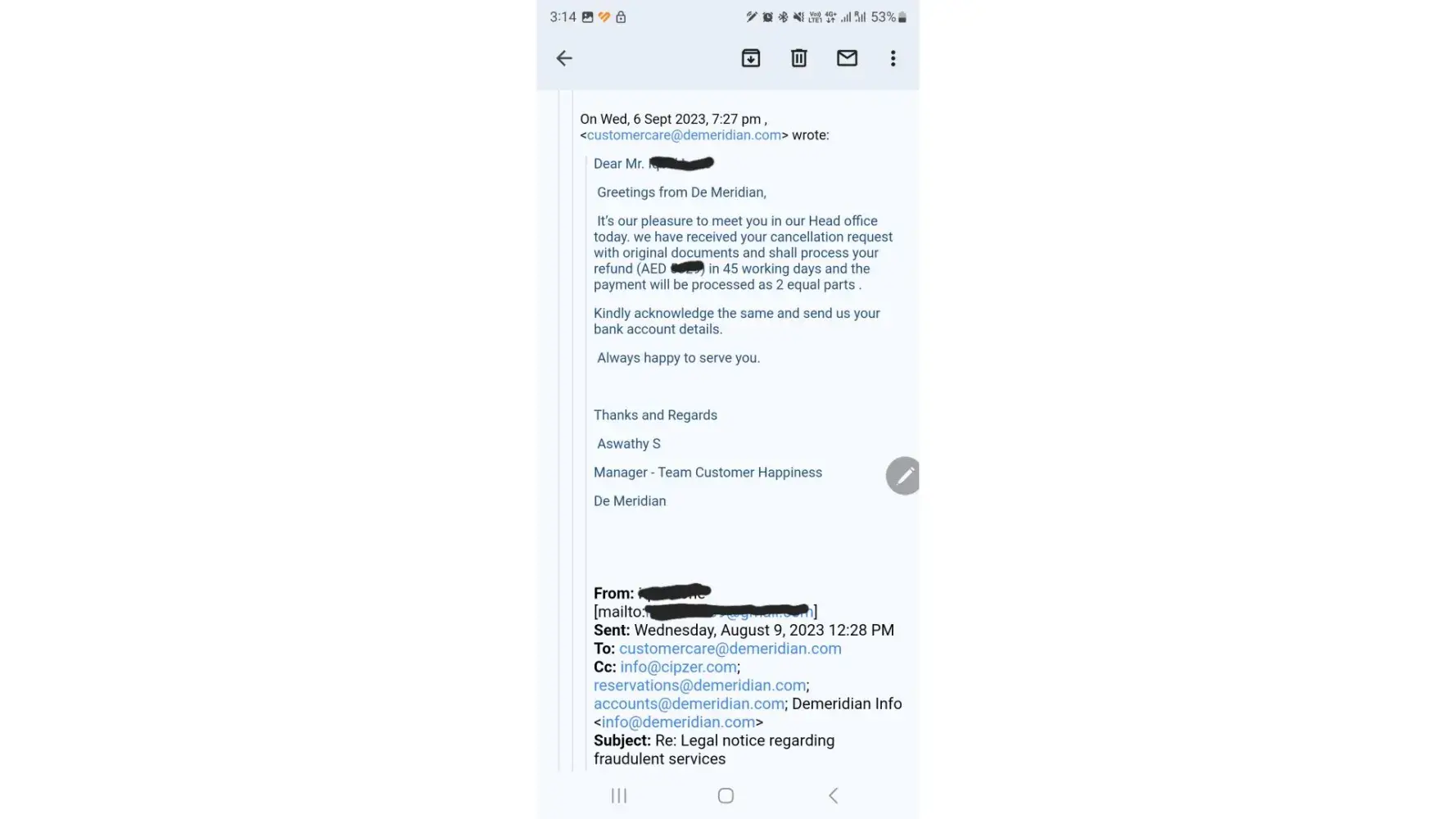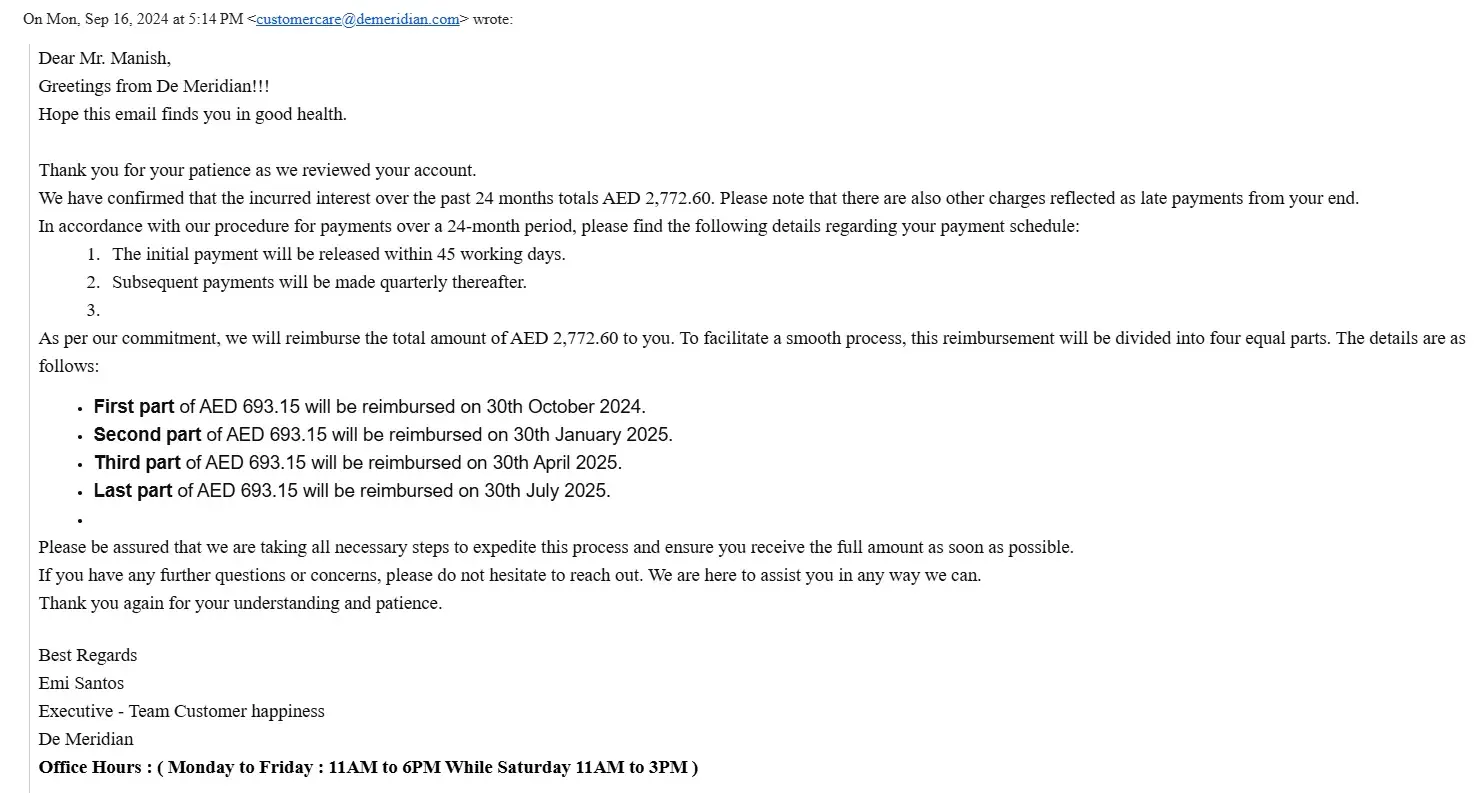 On 4th May 2023 Mr. Usman & Mr. Pushkar called me to your office at Al Garhoud at 18:30 hrs, only to inform me that De Meridian will not be able to refund or reverse my amount. I requested them to consider my request & do the needful& until today no updates from them yet.
