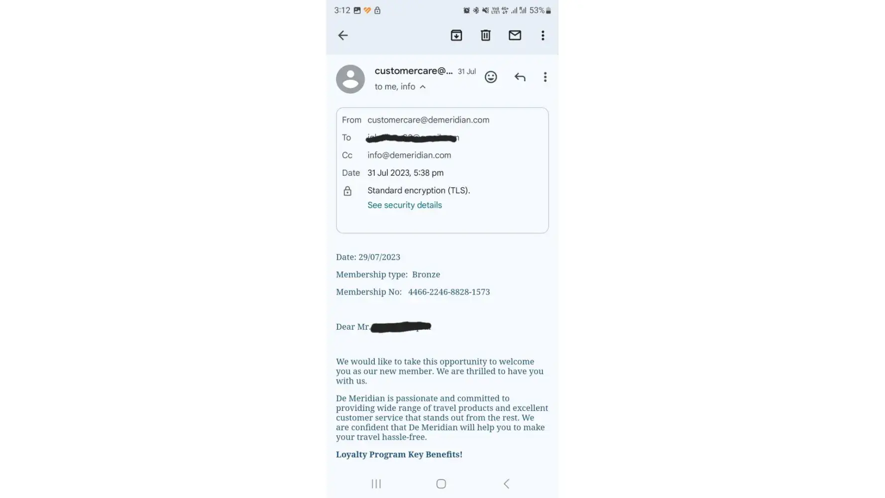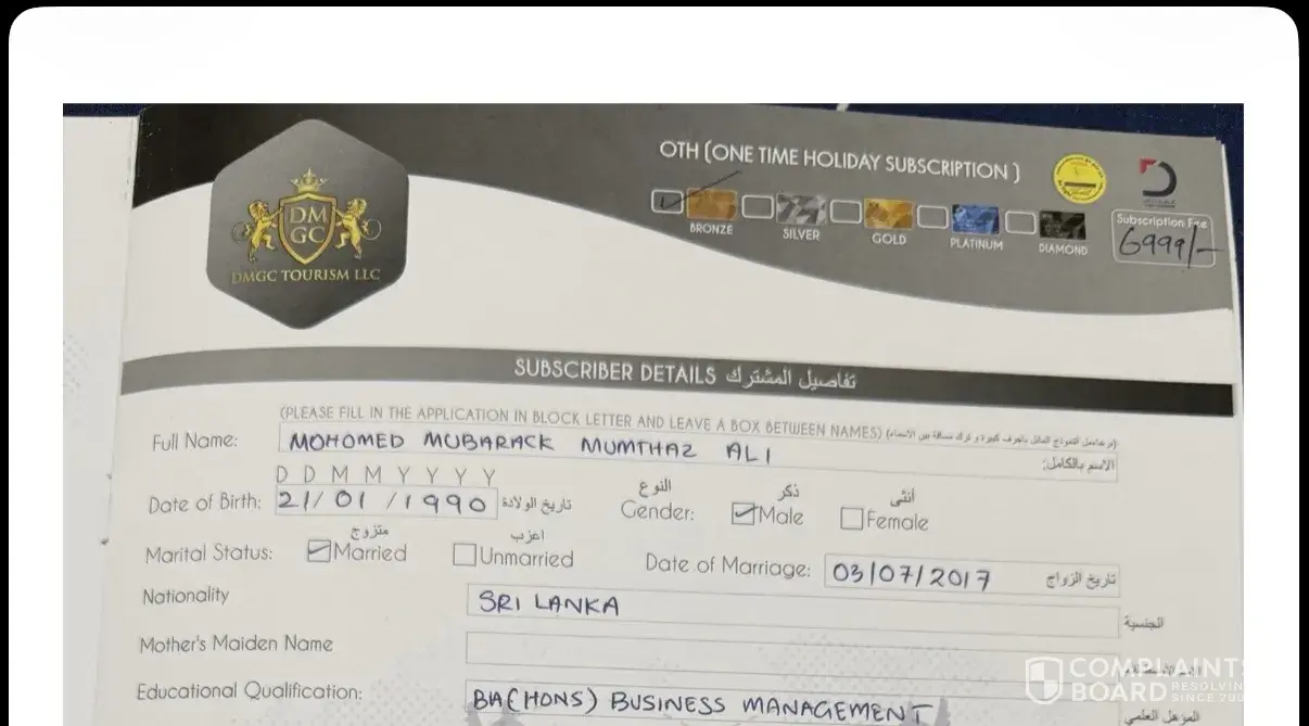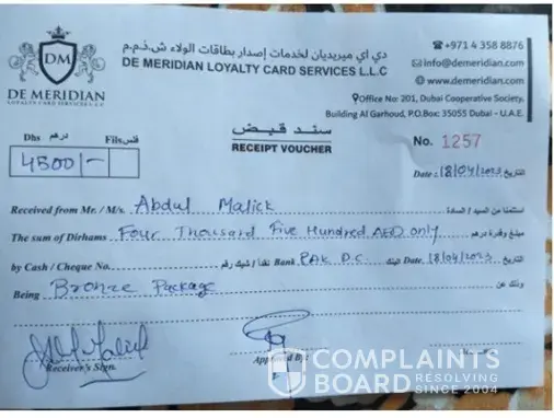 I paid 12,600 AED to De Meridian Loyalty Card Services LLC on 01-March-2025 at their office behind Le Meridien Hotel, near Airport Terminal 1, Dubai, expecting the promised loyalty card benefits: free hotel stays, travel discounts, and vouchers. What happened: Paid via debit card. Contacted them multiple times at reservations@demeridian.com and...