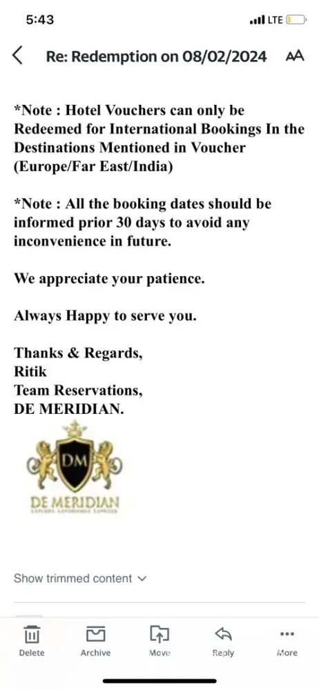 De Meridian gave me a voucher for a desert safari in Dubai & an International Hotel Voucher for Couples that I requested to redeem in May 2023 But Unfortunately due to some medical issues I Postponed it to December and they Redeemed my Voucher Desert Safari Voucher on Dec 18 2023 And redeemed Couple hotel voucher on Jan 5 2024 in which me and my Husband extremely Enjoyed that desert Safari and we used hotel voucher when we took a short Vacay to Azerbaijan.