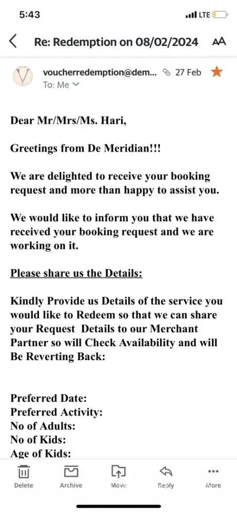 I had attached all photos of your perusal, I had already sent email for the redemption of the voucher number 5047 which was given by Hazel your sales person, it’s says that I have to book in prior of 14 days how ever I placed my booking before 18days and till now only one reply came and still not very sure weather we will be going to the Dessert Safari on the 08/03/2024.