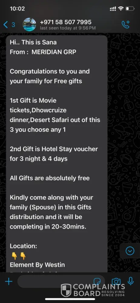On March 7, 2025, I experienced a scam by De Meridian. They offered my wife a “gift†and invited us to collect it at a hotel in Al Garhoud, Dubai (Ground Floor, Element by Westin, behind Le Méridien Hotel). Once there, they lure you in with attractive offers, promising hotel stays and travel tickets. However, they pressure you into signing multiple documents, using legal loopholes to manipulate contracts.