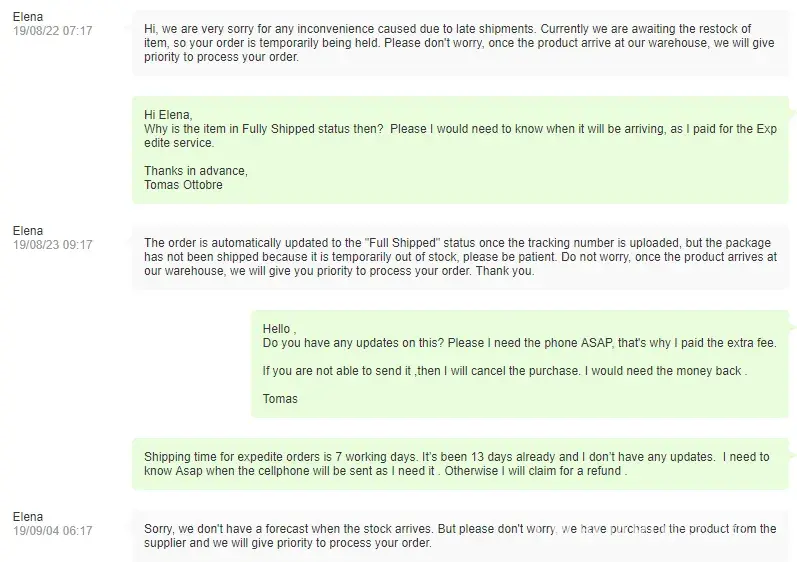 I paid for it on August 11th for the expedite service(1 week delivery) and I still don't have confirmation that the phone has been dispatched from China to my country Argentina.