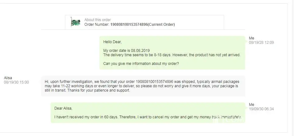 As for the defective watch, they sent me another one a few days later, which was also defective. I informed them of the issue, but I never received any response from them.