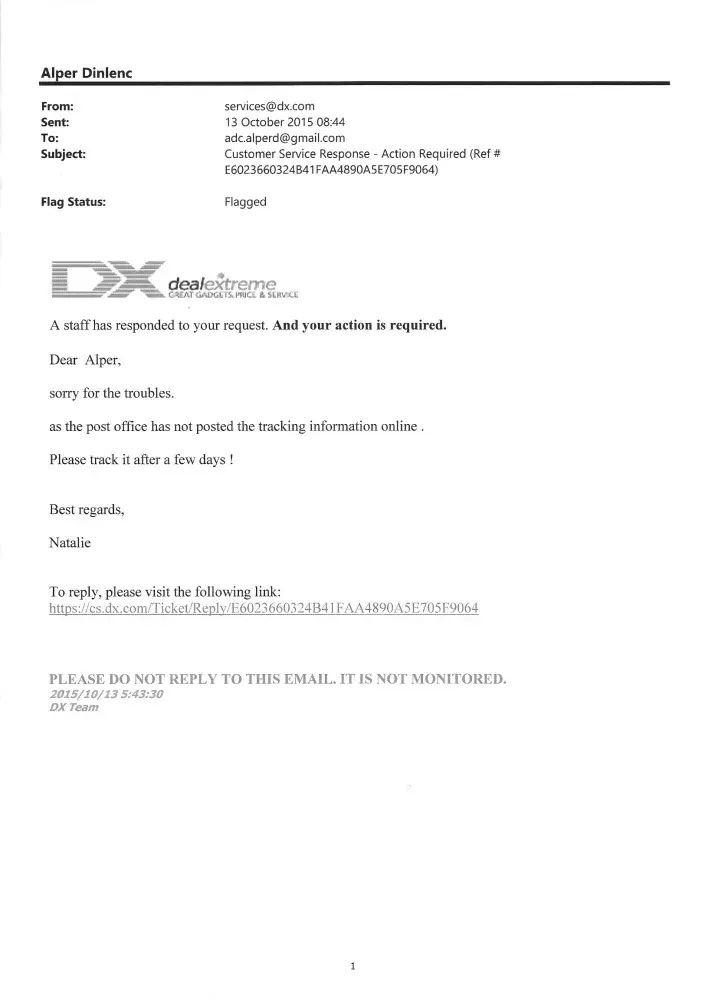 I had to call my post only to find out that the product is stuck and cannot pass through because they were missing a document.- DX should have known about this. When I told them (by sending several messages and finally calling them), they sent me yet another automatic reply by saying that I should wait, for another two more weeks.
