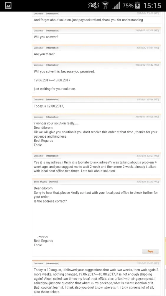 i ordered an xbox 360 charger and battery packs from them on feb. 20th. i was told i would receive it on march 21. i never did so i contacted then via live chat. i cant call them being in hong kong. they said it was in amsterdam. they said wait 2 weeks. well i did, then i contacted them again april 9th and was told that it was lost for 2 weeks in amsterdam and i needed to wait 2 more weeks. i asked for a manager and recieved an email for one. it was [protected]@gmail.com. i have sent multiple email to her regarding reimbursement oir refund and i never get a reply. i contacted them again and told them i needed another manager and i am told that she is the only one. then i am told that its 2 am there and i need to contact them later. when i do then its still 2 am. its a scam i believe. i still never received my items so on april 27th i contacted them again and was told that it was in the UK and i need to wait 2 more weeks. im tired of all this. i checked other websites and there are 1000's of complaints from this company. i just want my money back immediately. i dont trust them with my card info.