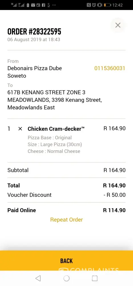 On the 12th August 2019, I tried to order pizza worth R139.90, but I received an error and the order was not placed successfully but the funds were reserved from my account still. I called the shop and they advised they did not receive my order, perhaps the funds were going to be reversed back into my account. On the 13th August, the funds that were reserved were banked by Debonairs. Please see the attached.