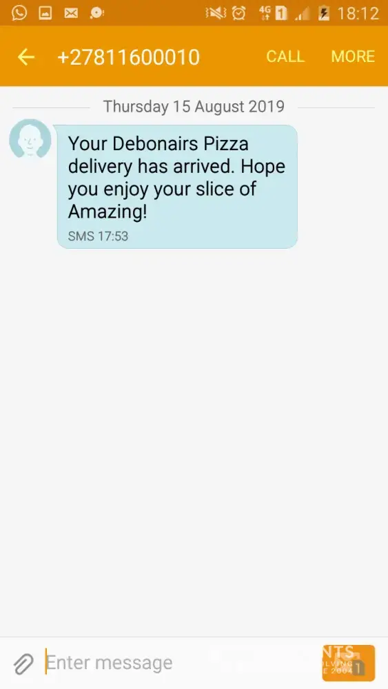 I ordered pizza from Debonair's Pizza at 12:28 at 15:45 I called them back for the second time and this after I called their customer service center and seeked assistance via their app, and they told me that my order was delivered. Where, when I've been at home and received nothing. The driver argued that he made the delivery. They asked to call me back. 25 minutes later they eventually do but still argue that they made the delivery. When I tell them that I have information about my order backed up on my cloud and that the said address isn't the address I typed in, they started apologising and said that they will rectify the mistake. It's now 16:20 and I'm still waiting.