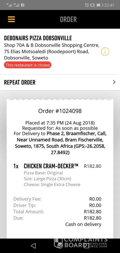 I've place an order at Debonairs Umhlanga. (Jubilee grove). The order were delivered 2 hours later, ice cold. I've called the store manager. She apologized and said they will replace the order for me the next day at 17:00. The next day came, I've called the store again at 17:20 only to realize the previous store manager went off duty and didn't relay the message. I then spoke to the manager and he said he first need to confirm with her and will call me back. After half an hour I call the store again and the manager said it's fine he will replace the order but I can only expect my order after another 2 hours as he don't have drivers. I decided to work late as dinner would have been sorted for the family, but to my disapointment this were not the case. We've been a regular customer, unfortunately we won't make use of their service ever again. Extremely disappointed.