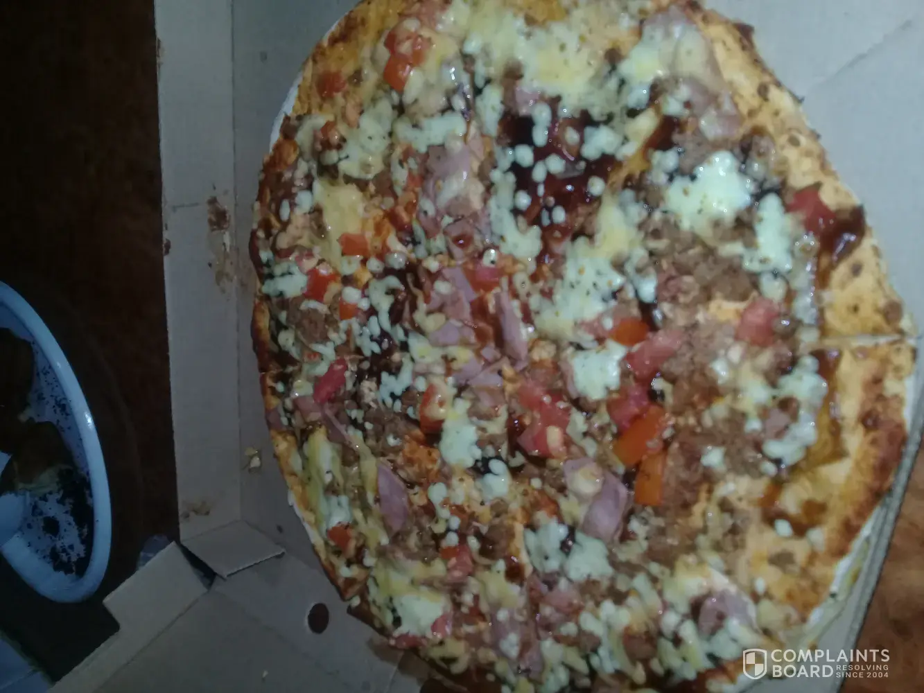 I phoned the manager Charles and he said the pizza could not be replaced as we already ate from it, I had 2 pieces and my husband 2. Was not aware that we could not eat the pizza to complain as it was a very rainy day and I did not plan to go back to the shop.