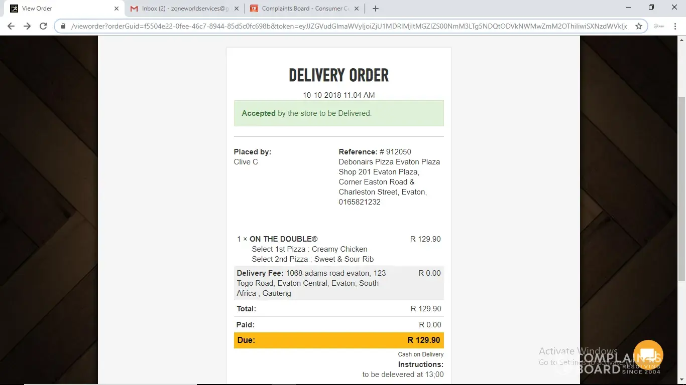 We have placed an order on 28 September online amd paid online aswell. After 2 hours we only got delivery. With no contact from debonairs van riebeeck park branch as to what is causing the delay. Then when food eventually arrived it was cold and not enjoyable at all. In fact I did not even ate mine after one slice that is how awful it was. We have actually tried to contact the branch several times to find out where is our delivery. The one time we could get through the lady that answered just replied delivery is on its way. Yet hour and a half later only it was delivered and she cut the cal! Firstly the lady that answered did not even ask my details so how did she know what order i was talking abt in the first place. She asked no reference or cell number. We then phoned back again wothout any sucess as we have still not received delivery at that point. Phone was just ringing on end until you get message the call can not be taken right now. This after we have tried several attempts to get hold of someone. I then called the customer care line and i was just advised they will TRY to get hold of the branch, yet no further feedback received from them aswell, guess what again poor service received. This is the most inappropriate, disgusting extreme poor client service we have received from debonairs and then ontop of this when we got delivery the food was cold! Please have this addressed and I expect urgent feedback on this matter. Order ref