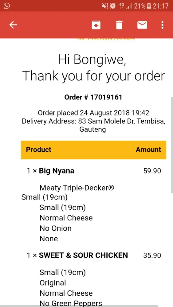 On the 26th of April I ordered a 'half-and-half' pizza from Debonairs Parow in Cape Town.