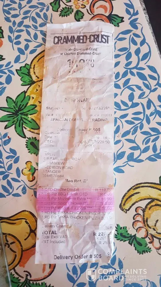 I ordered pizza yesterday at Jabulani Mall around 2 pm and delivery was at 3 pm now my problem is the pizza was too dry and I had a stomach bug after eating it. I thought I was the only one but I have asked few friends and some say they do have a stomach bug afraid eating your pizza, I think there's just perhaps on your ingredients that causes this or allergy. ..I am sick as hell