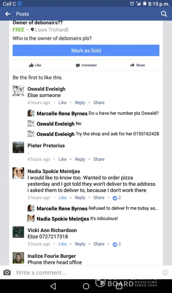Ordered take away pizzas @ 7.10pm, was told delivery will be made in 30mins. an hour later no delivery. Another hour later I was told order on the way. 30 later still no food so I drove to the Branch only to find my order iced cold sitting on the shelf. When I queried I was told that no deliveries would be made after 7pm! I asked the Branch Manager to call the Owner as he was in the office and passed by me. The owner said "he is tooo busy to speak to me and that I should be given the order for free" thats not the issue I am more than prepared to pay for my food! several people waiting at the branch complained about bad service. I logged a complain with the hot line no. Received a ref on the 21.01.2015 & still waiting for someone to revert back to me. So the owners attitude is "to hell with you, I dint need your business"and seems like Debonairs head office has the same attitude!