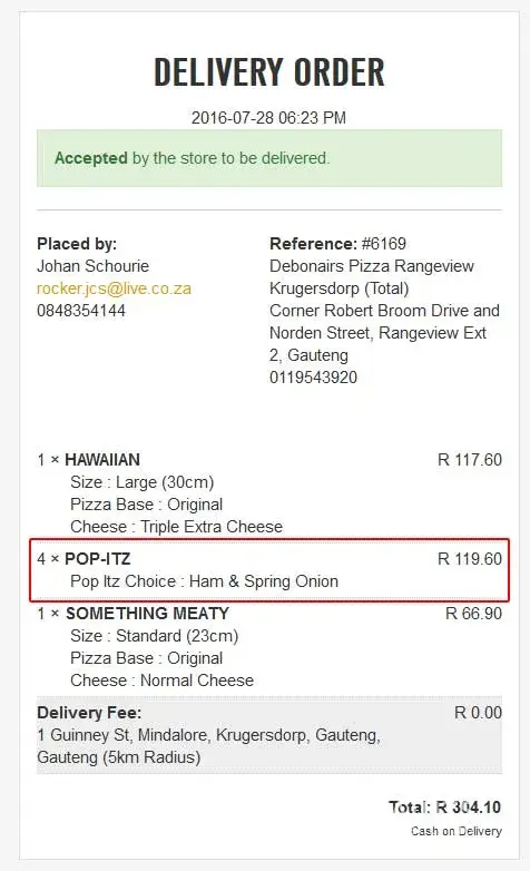 Saturday the 20th of February I ordered two Pizzas and PAID for them. Monday the 22nd of February Mr Lategan(manager) called me and said I need to come into the branch and pay for the extra 2 pizza's I took. I told him I only ordered and received 2 pizzas and they were paid for. He then said he has video footage of me taking the pizzas and I didn't pay for it and if I do not come and pay for it he will call the police. I wrote to Debonairs on the 23rd of February and after 12 days still did not receive a response to my complaint. I called numerous times to follow up on the complaint and I was just told that they were looking into it. The manager who called me and accused me was so rude and I was totally disappointed that I didn't get any feedback on my complaint especially after calling to follow up and still not getting a response. I get pathetic and horrific service from a manager and then nobody gets back to apologise. The call centre agent mentioned that their system said the manager made a human error. If rudeness and falsely accusing is a human error then I guess all crime can be classified as a human error!
