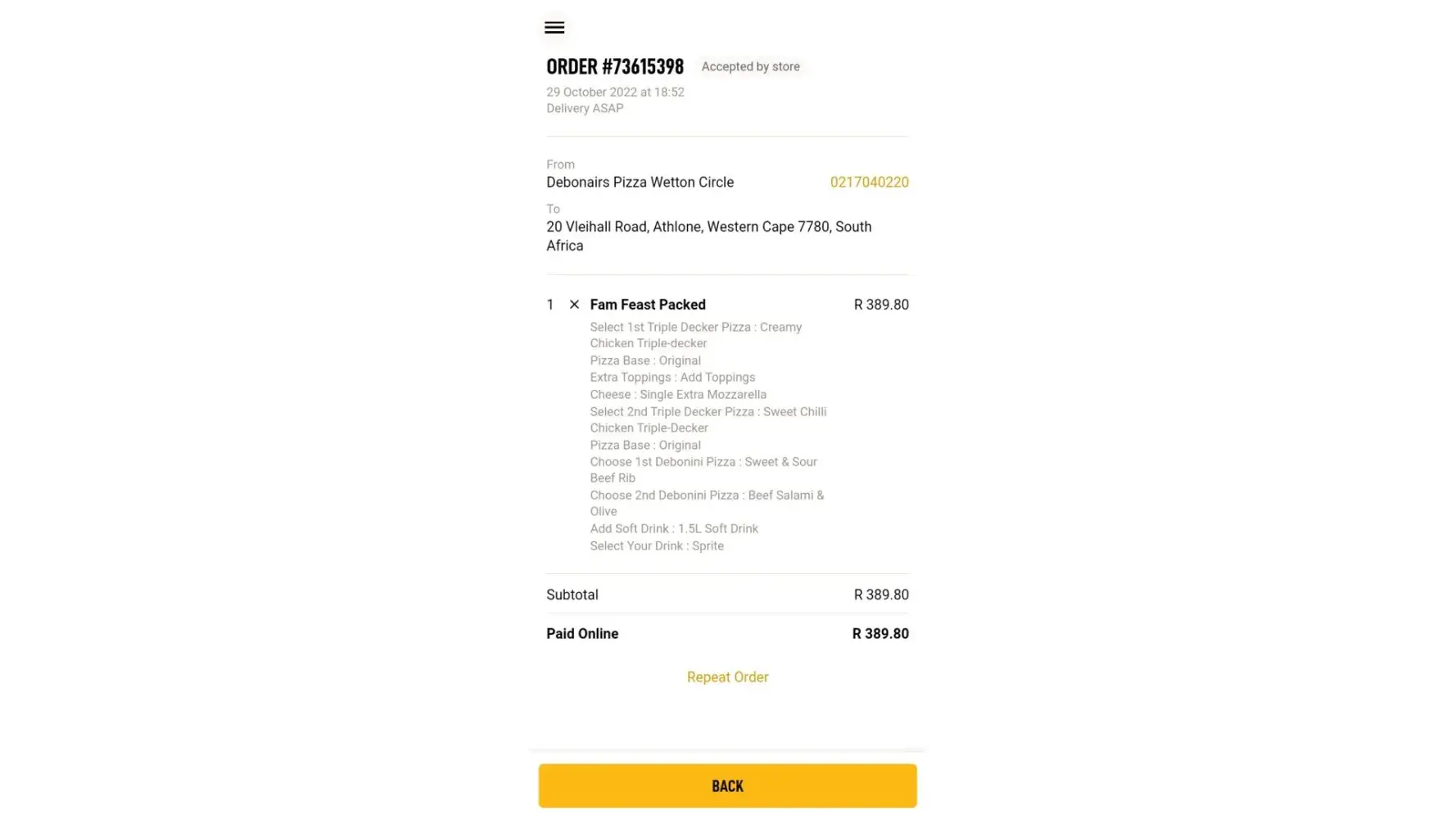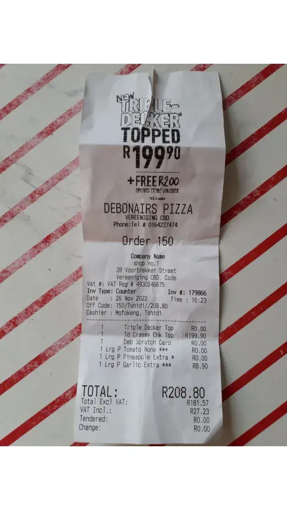 I bought the R208.80 triple decker topped pizza, labeled as order No. 150?, by 16:23 on 26 Nov 2022, at shop No.1 28 Voortrekker str Vereeniging CBD. My receipt invoice #: 179866