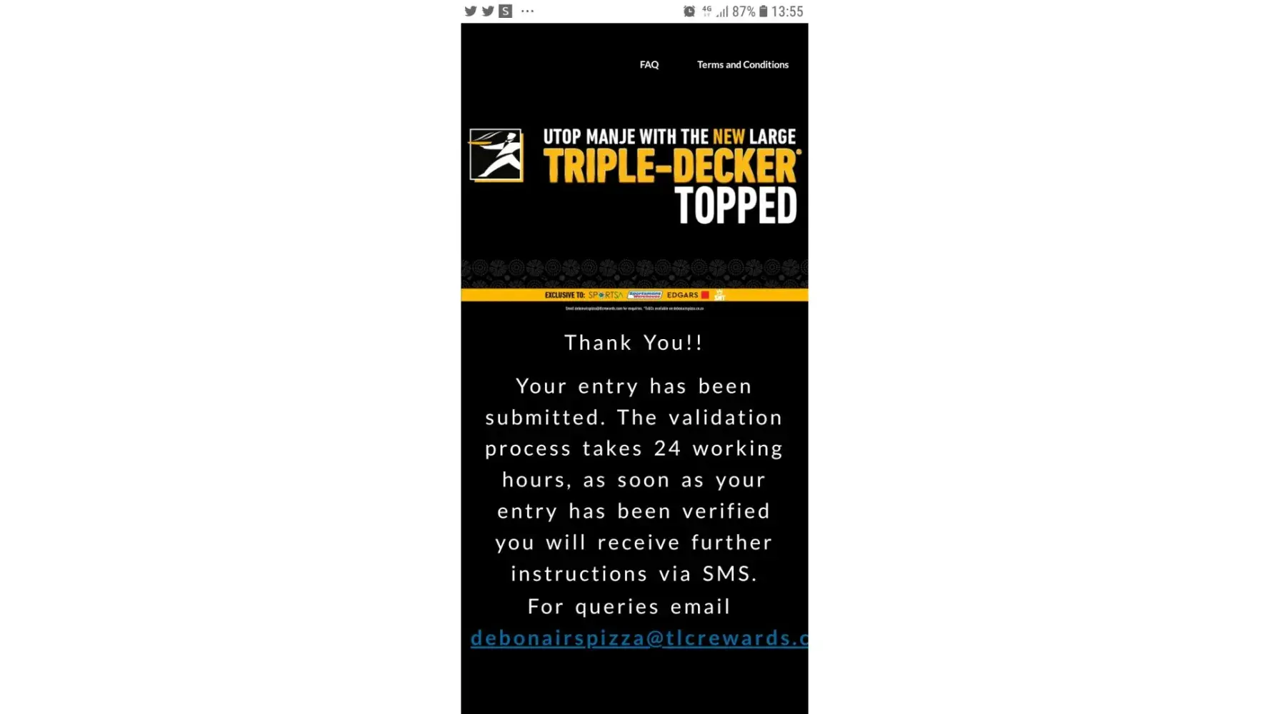 3. I immediate sent the same comment to [protected]@debonairspizza.co.za and this is what was said on live chat and per email: