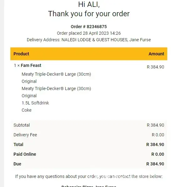 I normally order food from Debonairs olievenhoutbosch plaza with a card purchase online, so I was shocked that yesterday I never ordered anything from them but I got a notification from my bank that my card was used to make a purchase at Debonairs olievenhoutbosch plaza without my permission as I never ordered anything, and even if they said I ordered something from them how come they never told me or communicate with me regarding the order as they usually do
