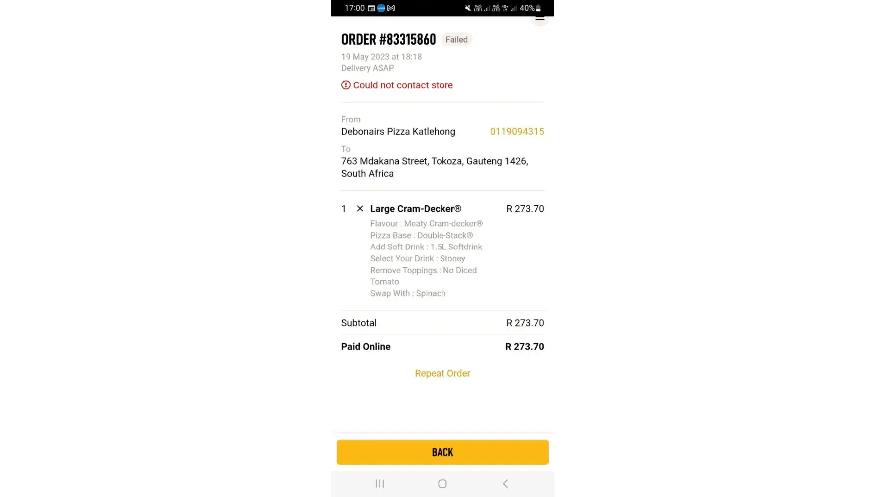 I orders a pizza at Debonairs ...my apologies showed Dobsinville branches ,and they called to say try can't reach my destination.