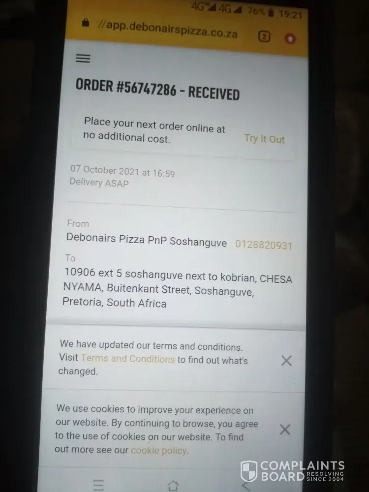 I hereby write this formal complaint regarding an absurd, most ridiculous terrible customer service today when I made an online purchase today. I place my order at 09:20 am only for the driver to deliver at 11:25 am. I called the store several times trying to understand what was the delay and sadly no one was answering the phone. I made contact with the customer care 3 times and even them could not reach the store. At 10:30 the store calls me and says they have no drivers available to deliver, how did they even accept my order knowing that they had no drivers on duty. The worst part is that when my order got delivered the driver lied to me and said they were in a meeting to top it all up my pizza was not even hot it was semi warm and it was stuck on the box. Am really dissapointed by this store. The store is debonairs pizza engen tembisa