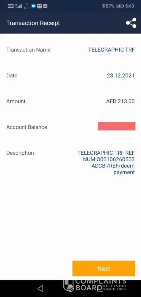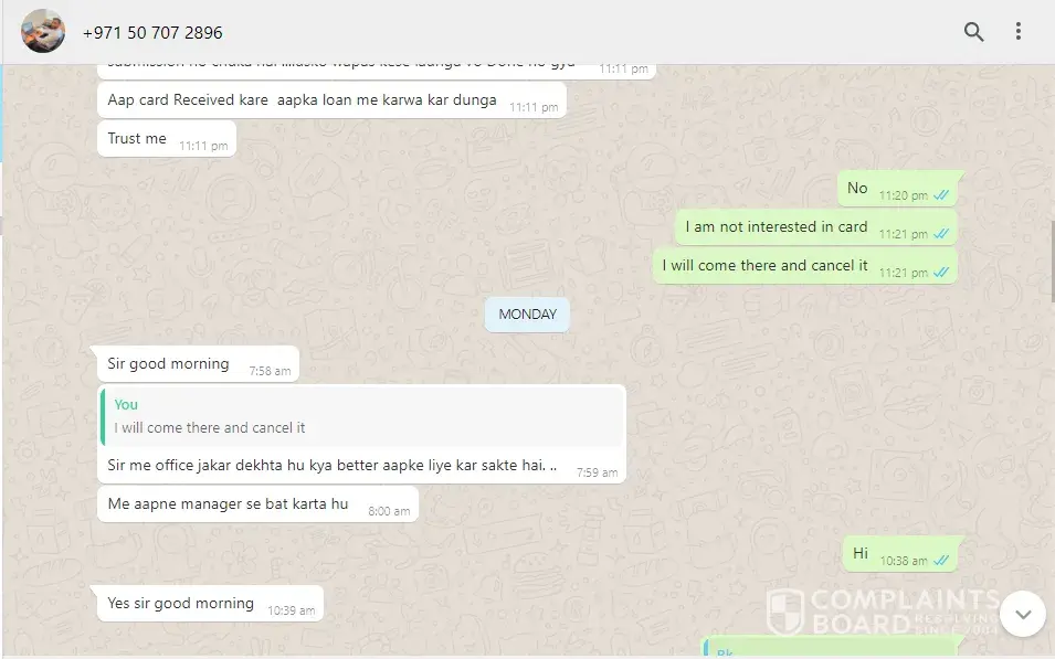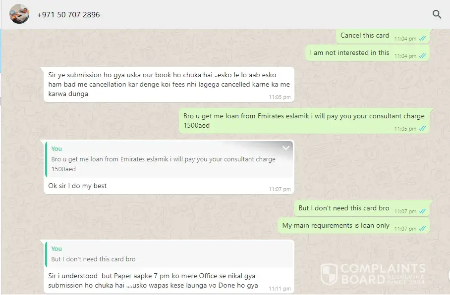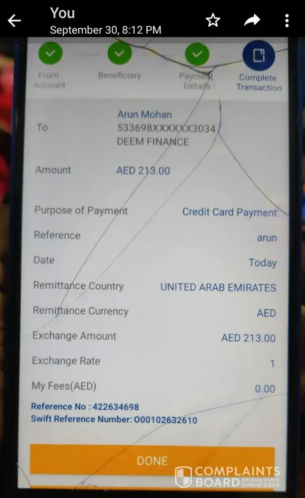 And after some times, the Deem finance claimed an amount of AED 498,349 in the same card number which they charged before. But actually, I did not receive the card and I have only the card I mentioned in subject.