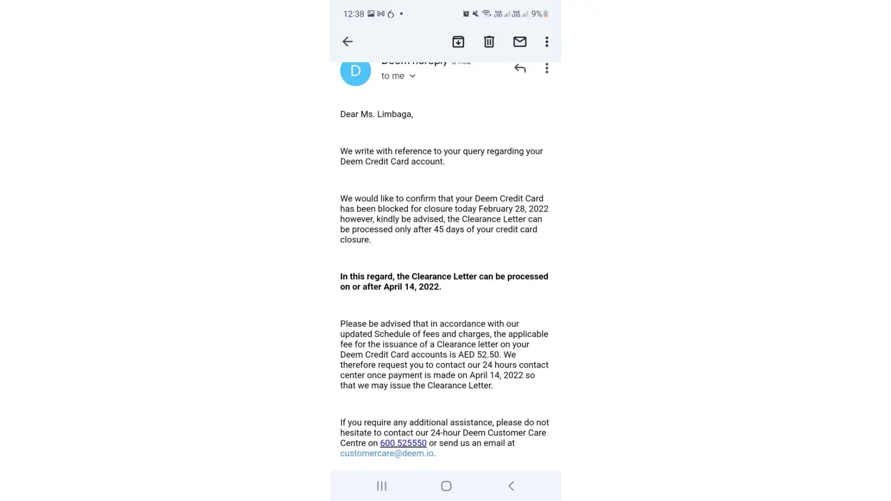 Kindly note since 2 weeks I am continuously contacting you regarding my credit card closure letter, but you are resisting to giving closure letter for silly reasons , I closed my liabilities from other banks like FAB Emirates NBD Etc same day I made the settlement through RAK bank , every bank closure letter and clearance letter received expect DEEM finance , while calling customer care says it will take 45 days to get clearance letter , and we are not providing any closure letter , after my settlement my card shows some excess balance of 1176.62 for getting this amount Charge 26.25 and for clearance letter charge 52.50 AED that i already paid , payment receipt attached along with this mail