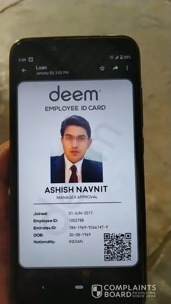 My name is James. 2 days before I saw in facebook for personal loan in deem finance and I shared my number. Then one person His Name Ashish Navnit contacted and given the details for loan. For the statement purpose he told to deposit 2000 dhs and as transfer loan charge 2300 and insurance agreement 1650 we paid..