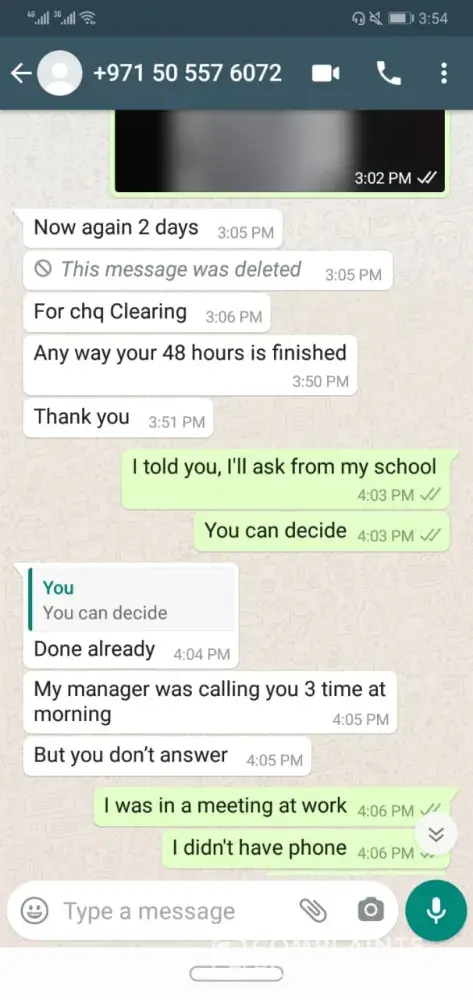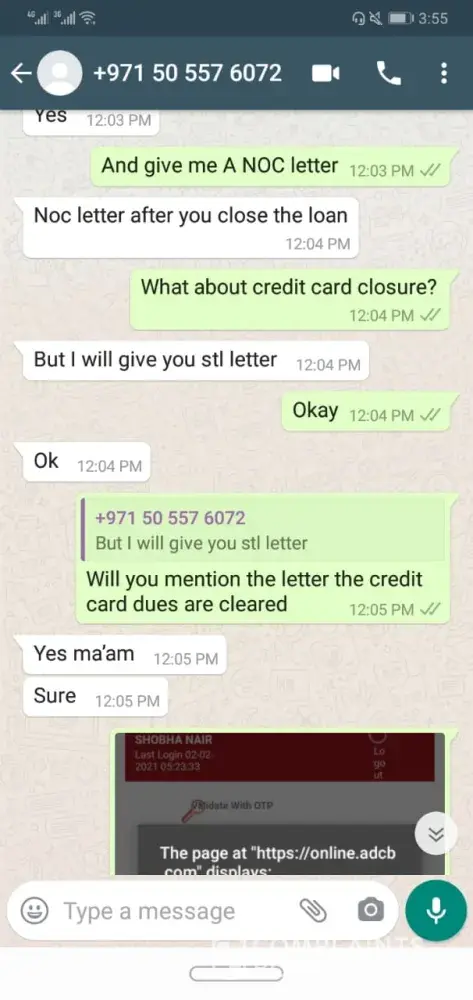 He started the conversation by agreeing to a settlement pay but never gave me a settlement letter, I cannot pay 1000 AED every month without a proper settlement plan or guidance, hence, I wrote an email, however, nobody contacted me for the same. Mr. Amjed keeps threatening me every month saying he will submit my cheque against both loan & credit if I do not make the payment. With all due respect, I'm not a defaulter with your loan & credit card all I started paying with an intention of closing it and by trusting his words. However, every month I'm being a victim of his threats (please check my screenshot) even today he did the same. I asked for the settlement plan, he sent a screenshot of my cheque to be submitted.