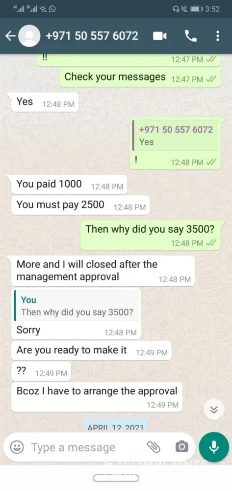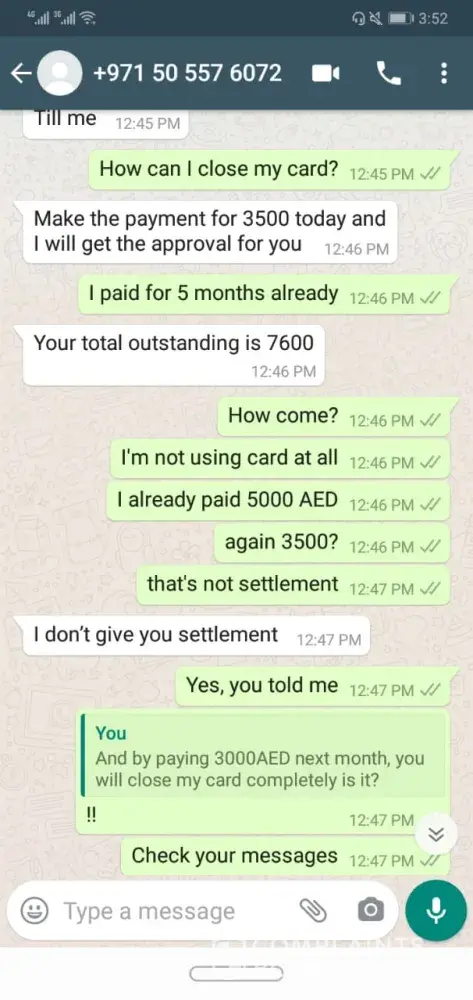 This is my 4th email regarding my credit card settlement and It is also a complaint on the collections agent who contacts me. I have a loan that I have never missed paying in these 1.4 years even when I was paid 50%, I ensured my loan amount was paid. Also, It has been 7-8 months since I had been using a credit card with deem and in November 2020, Mr. Amjed (+971 50 557 6072)contacted me for the credit card & he agreed to give me a plan if I pay 1000 AED for 4 months, last month was my 5th month and due to continued covid situation I couldn't arrange the 3500 AED, hence I asked him If I can pay 1000 AED this month & 2500 next month since He had agreed I made the payment and now this month again he is asking me to pay 3500 AED. Though I requested if I can clear it in 2 installments he was not ready to offer me a proper plan nor a letter.