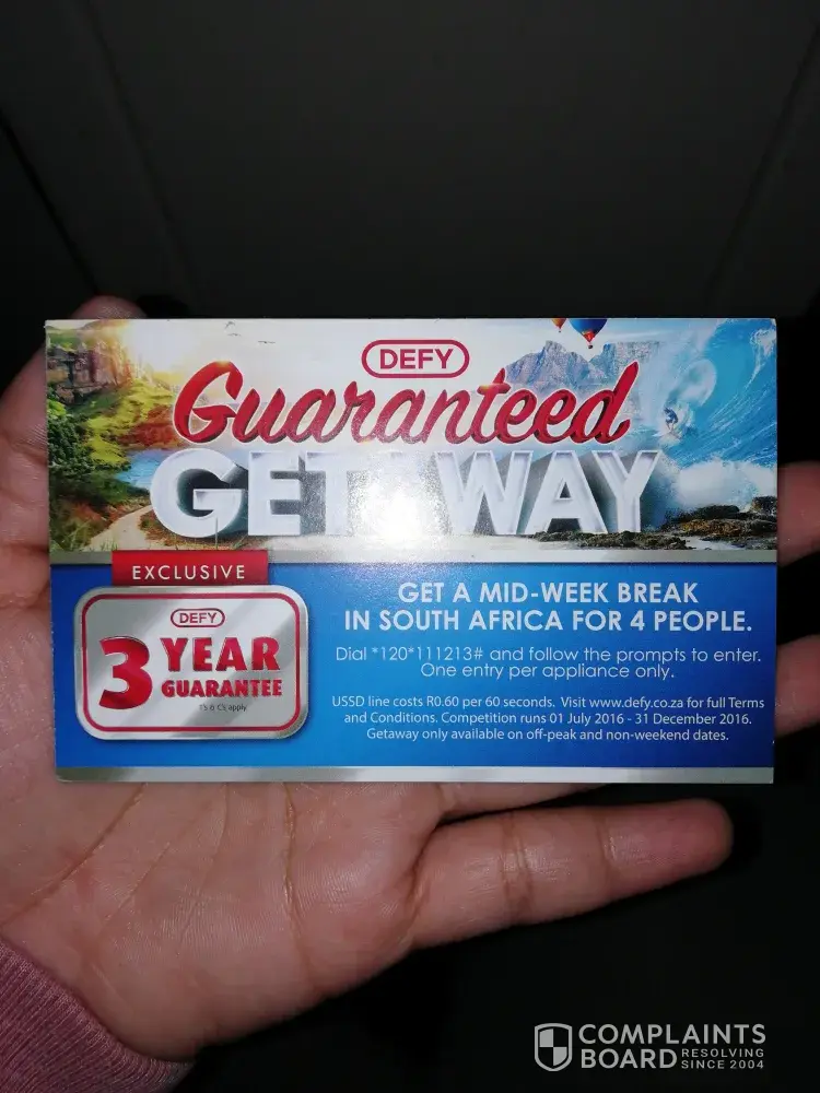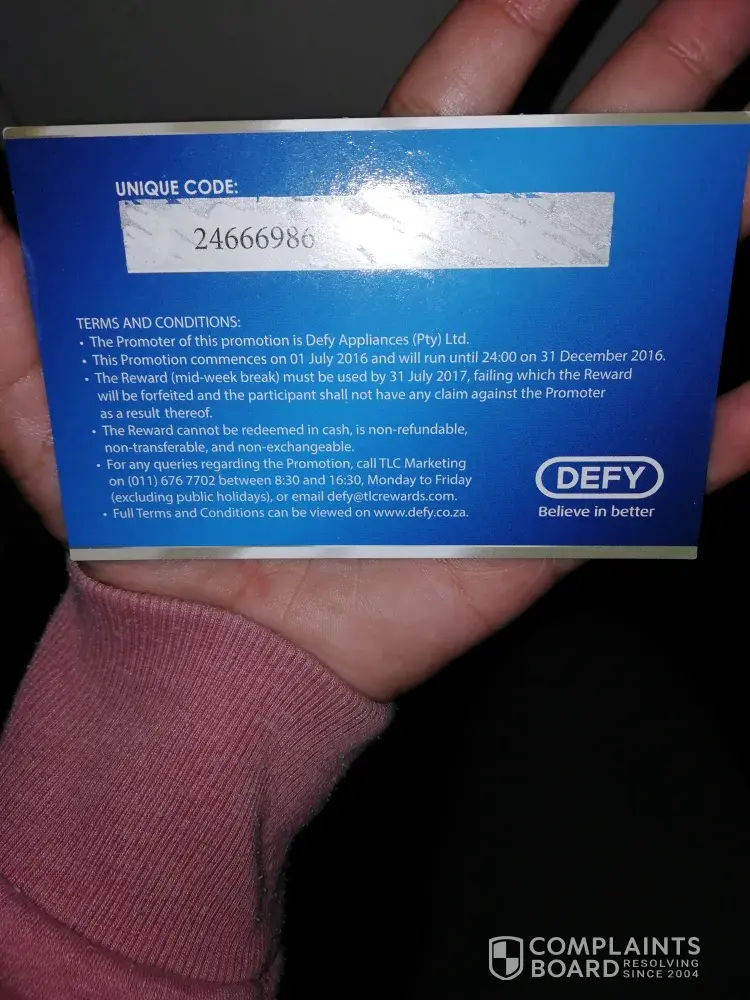 On the 26th August 2016 I purchased a defy 8kg top loader washing machine. The reason other than need a washing machine was because I was promised a free holiday. Please see the images attached. I have attached the card with my unique code upon purchase of the washing machine and my proof of purchase. To this day I have not received the promised free getaway if I bought the washing machine. My email address is tayla. [protected]@gmail.com.