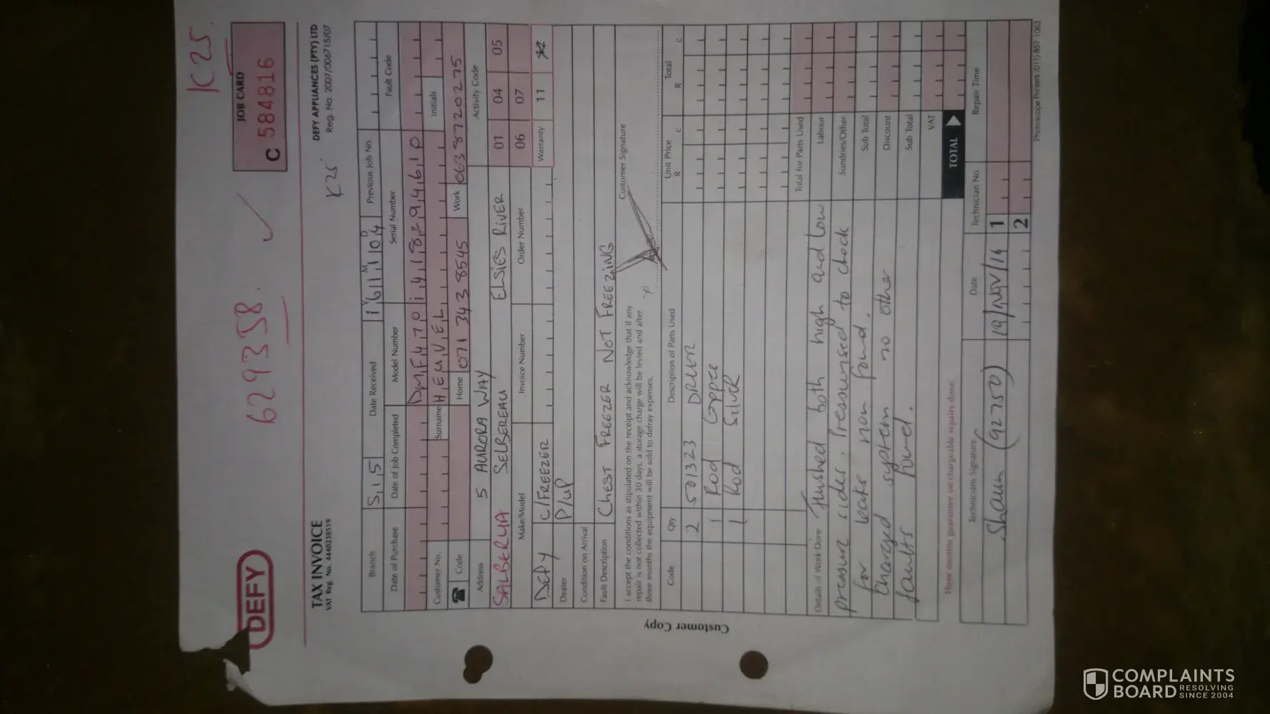 On the invoice it states the parts that was used but i am 100% certain nothing was actually replaced otherwise the freezer would be working without any problems. So i demand again that my freezer gets replaced or i will be forced to take Defy to social media and exploit the bad/deceitful service they give to their customers.