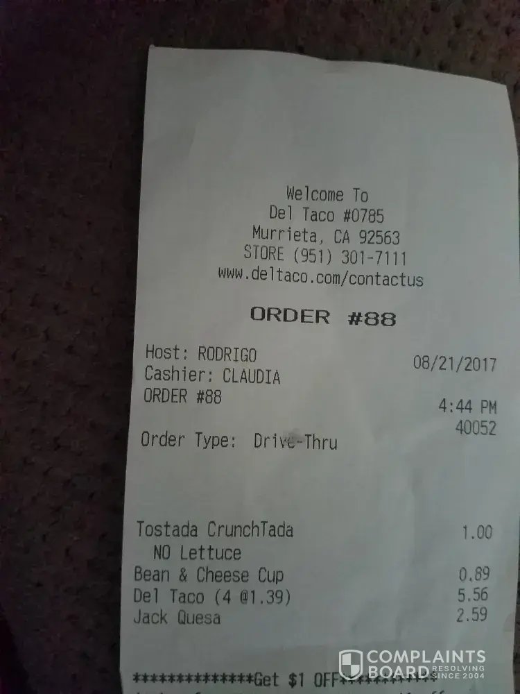 Went to the del taco on antelope and scott as usual go there alot. Have had problems with food there before but the manager asked to give them another chance, so we did. All has been ok not great just ok. Tonight 8/21 around 5:00 went and ordered 4 del tacos spicy jack quesadilla and a tostada with no lettuce. This is a same order all the time. We get our order, minus the quesadilla, told the cashier he said you didnt ordet it. Told it was on the receipt, he said no then realized he was wrong and the quesadilla was sitting on the shelf getting cold. Got home and my tostada is made with lots of lettuce little cheese and beans. Callef the store and asked for the manager, girl said wait smd then hung up on me. So i called back they took the phone off the. Hook now im angry. I have called back at least 20 times and 45 minutes still busy. I am going to continue to call till i talk to the manager. They need to read the orders very bad service.