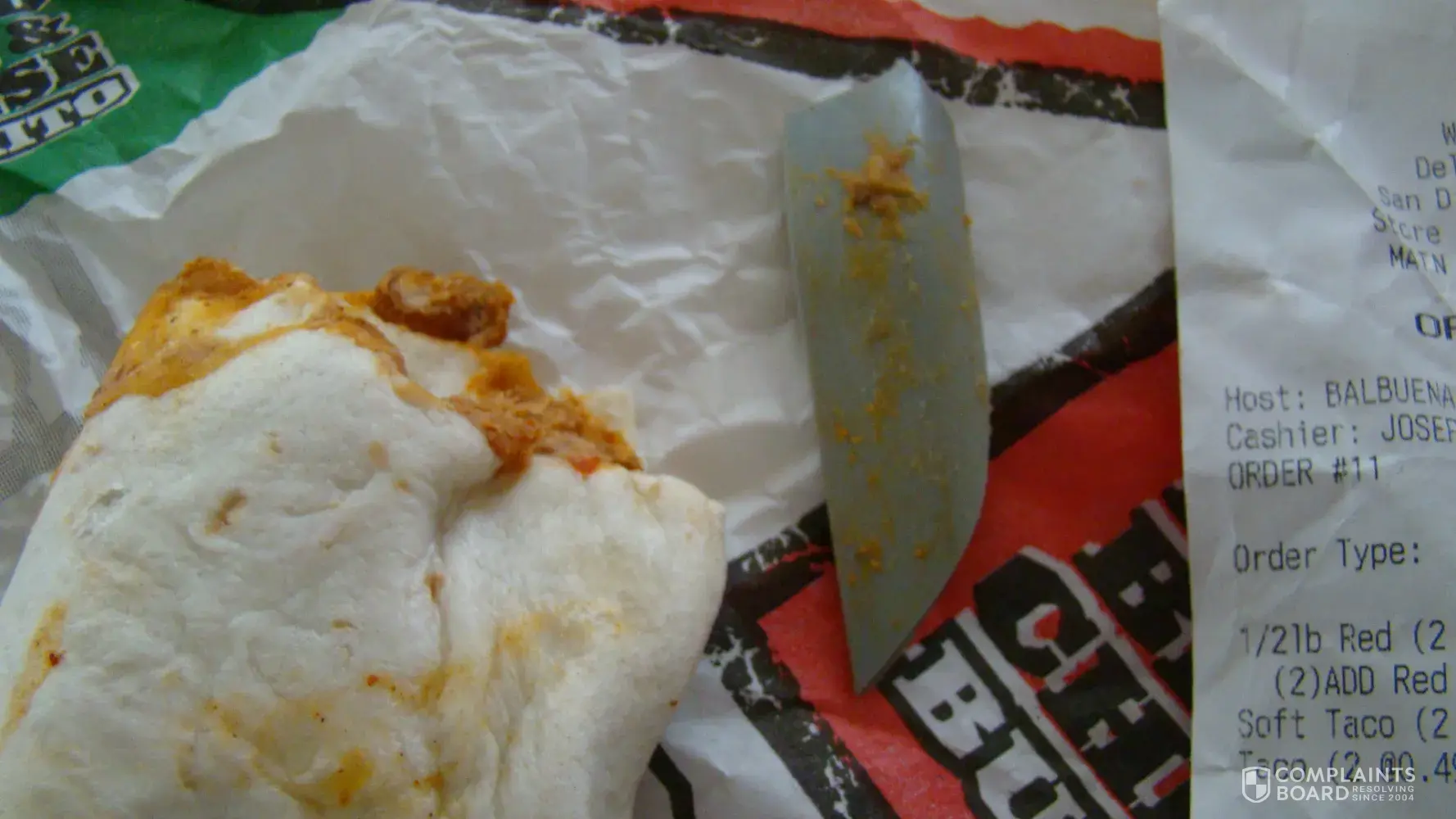 Please see these pictures attached. I had a bean and cheese burrito, bit into it and cut the roof of my mouth on this. I called and they said they would replace it. That was not good enough. They should be able to see something this big when smearing the beans on a tortilla.
