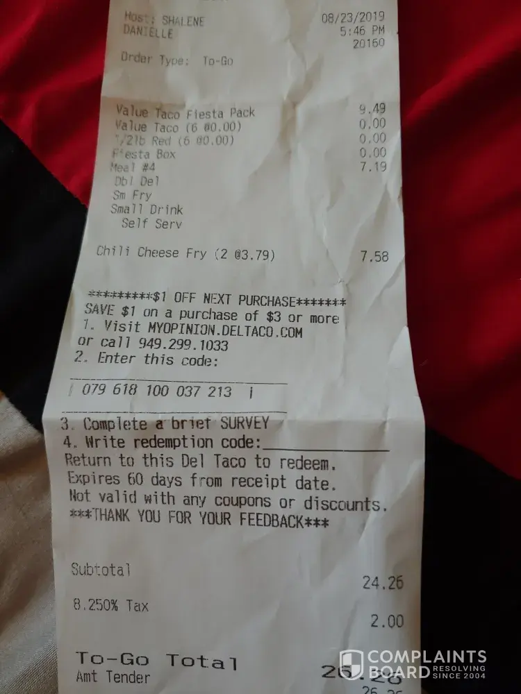 My receipt did not even have the numbers so I could a dollar off my next visit, if there is one! If you do not respond quickly and do right by me, I may never go back to Del Taco. That would be such a shame as I love the food and it is near by my home.
